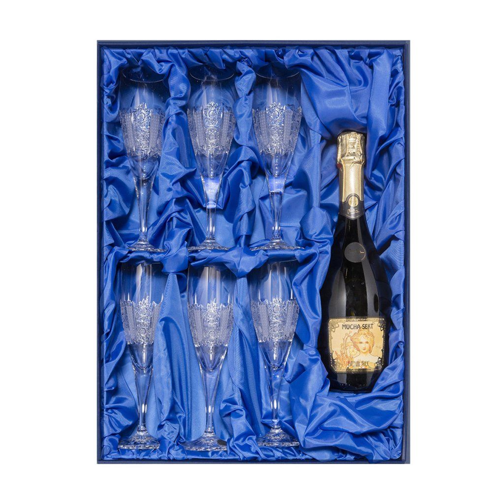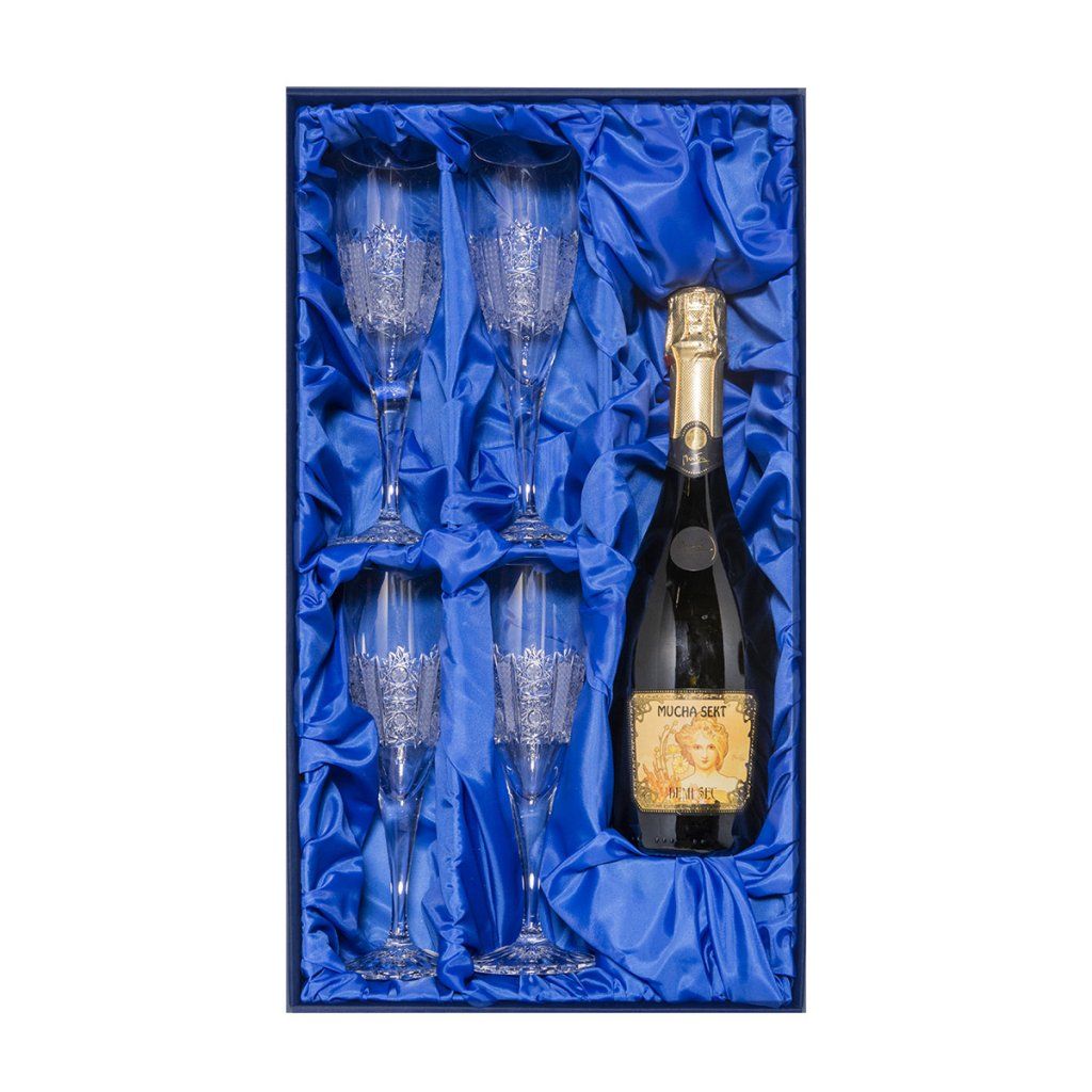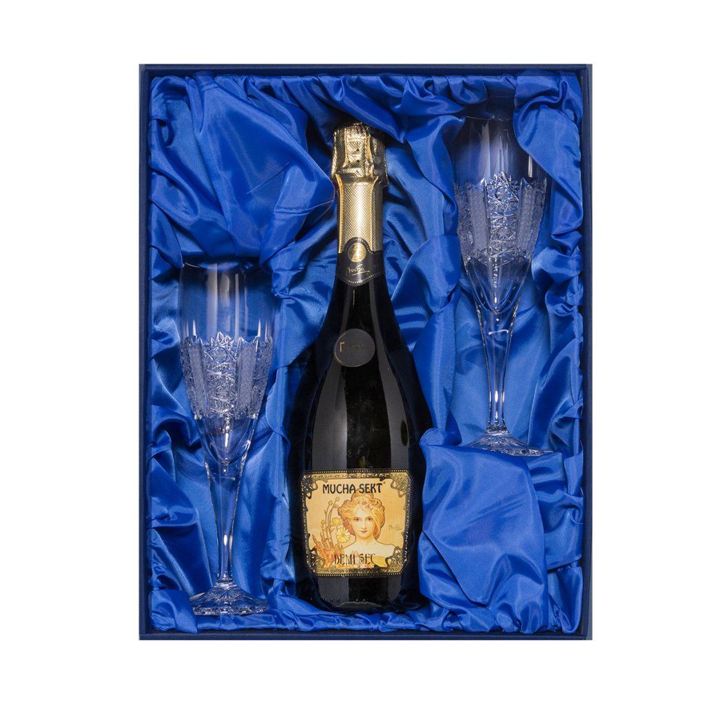 DÁRKOVÁ SOUPRAVA: sklenice na šampaňské jsou spolu s Mucha sektem perfektně uloženy v dárkové krabici vystlané saténem. Toto luxusní balení se skvěle hodí jako typicky český dárek mezi blízkými nebo dárek firemním partnerů.