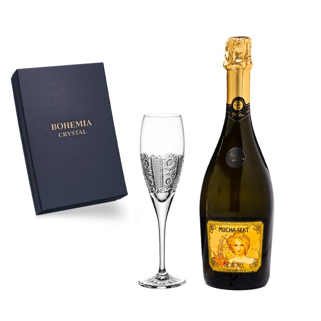 MUCHA SEKT DEMI SEC: nedílnou součástí dárkové sady je MUCHA SEKT DEMI SEC. Tento polosuchý sekt zaujme jemnou vůní biskvitů rozprostřenou na delikátním ovocném pozadí. Ve skleničce vás poté potěší jemná pěna a gejzír bublinek.