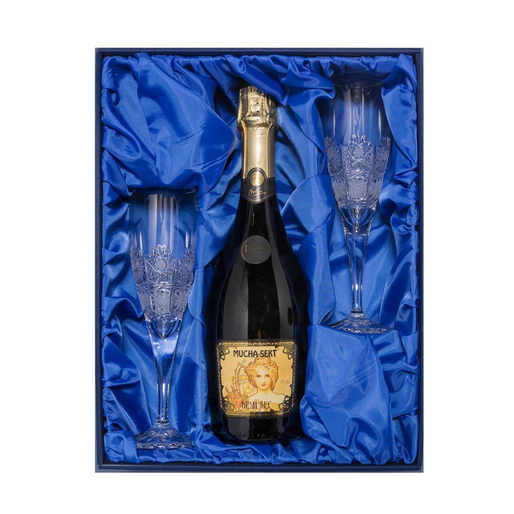 DÁRKOVÁ SOUPRAVA: sklenice na šampaňské jsou spolu s Mucha sektem perfektně uloženy v dárkové krabici vystlané saténem. Toto luxusní balení se skvěle hodí jako typicky český dárek mezi blízkými nebo dárek firemním partnerů.