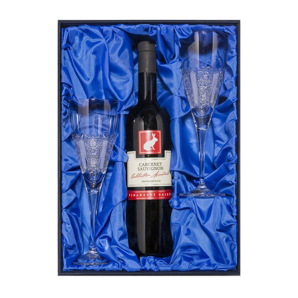 Sada 2 sklenic a lahve vína: Tato sada obsahuje 2 křišťálové sklenice a lahev moravského suchého červeného vína Cabernet Sauvignon. Vše zabaleno v dárkové luxusní krabici se saténem.