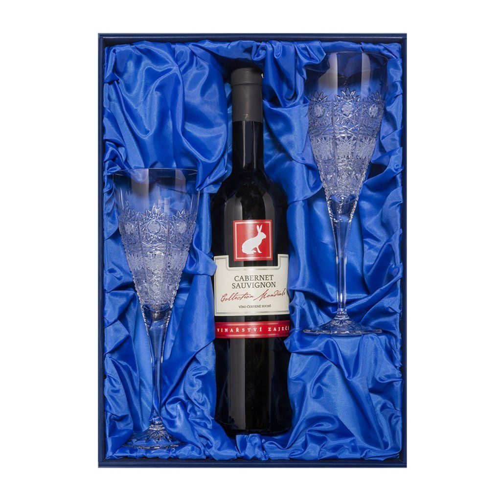 Sada 2 sklenic a lahve vína: Tato sada obsahuje 2 křišťálové sklenice a lahev moravského suchého červeného vína Cabernet Sauvignon. Vše zabaleno v dárkové luxusní krabici se saténem.