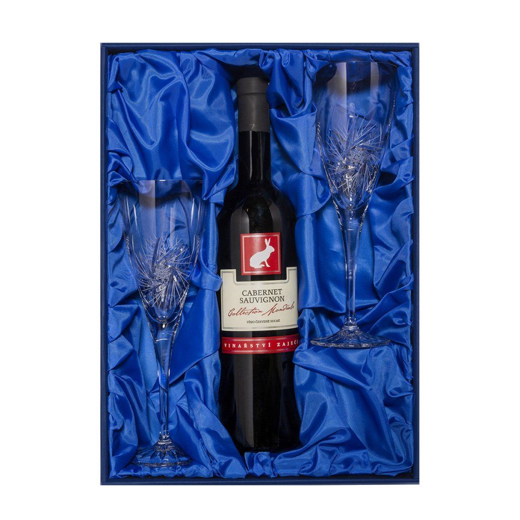 Sada 2 sklenic a lahve vína: Tato sada obsahuje 2 křišťálové sklenice a lahev moravského suchého červeného vína Cabernet Sauvignon. Vše zabaleno v dárkové luxusní krabici se saténem.