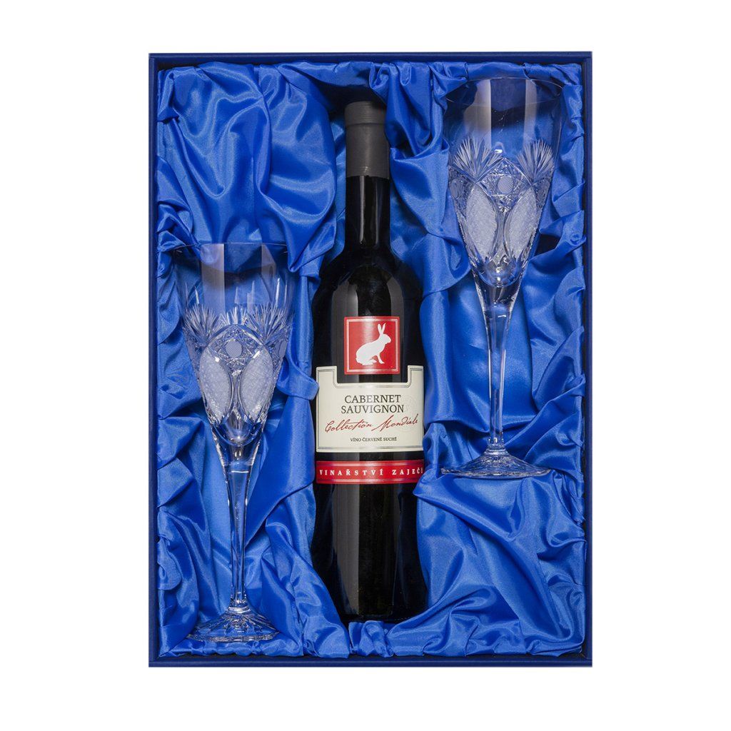 Sada 2 sklenic a lahve vína: Tato sada obsahuje 2 křišťálové sklenice a lahev moravského suchého červeného vína Cabernet Sauvignon. Vše zabaleno v dárkové luxusní krabici se saténem.