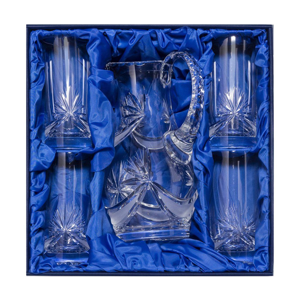 Naše Bohemia Crystal luxusní souprava v dárkové krabici se saténem obsahuje skleněný džbán a čtyři nebo šest sklenic, to vše z českého ručně broušeného křišťálu Bohemia Crystal. Skleněný džbán s uchem i sklenice jsou dekorovány brusem Mašle. Soupravu dopručujeme k podávání nealko nápojů, jako vody, džusu, domácích limonád nebok podávání piva. Dokonalá práce českých sklářů a brusičů. Skvělý firemní dárek, dárek pro obchodní partnery, nebo mezi přáteli.